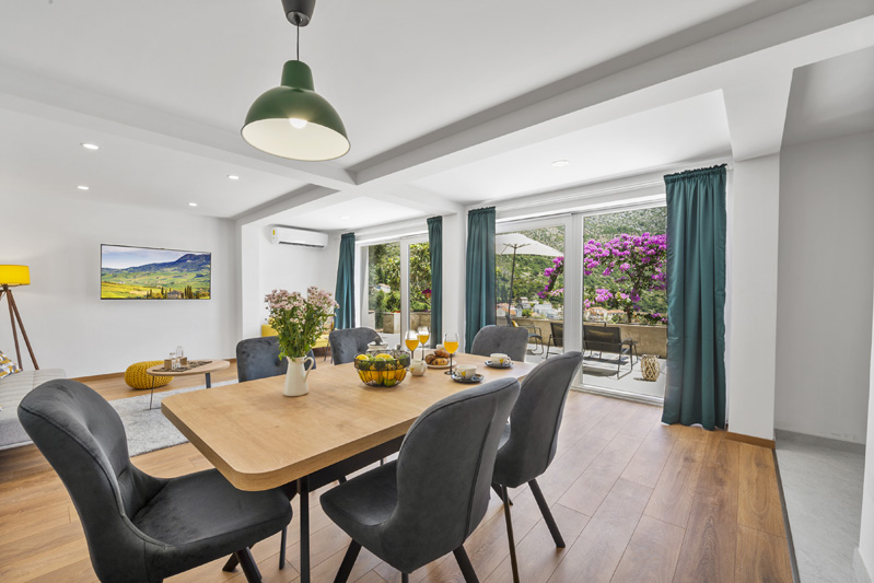 The ground floor area is completely connected to the outside area thanks to the large opening windows. Terrace is comfortably furnished, intended to relax with a morning coffee or an evening drink, and a barbeque in the surrounding garden