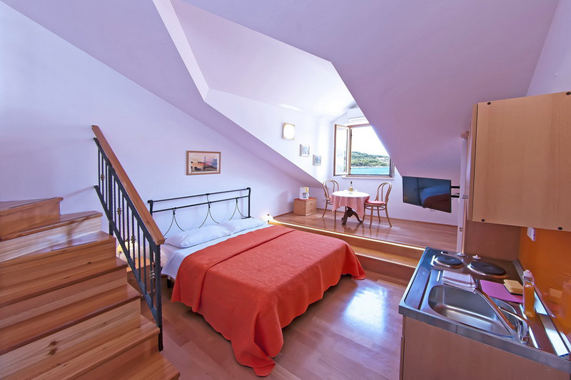 Our orange studio apartment is situated on the second floor of villa Ana! Orange apartment has attractive interior with two floors. Second floor is small gallery which you can reach with wooden inner stairs! This fact makes it comfortable and pleasant for stay of 2 . Apartment has own bathroom with tub and mini kitchen. Total size of orange apartment is 32m2 and it has official category of 3 stars.